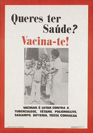 Left: Queres Ter Saúde? Vacina-te! (Do you want to have health? Get vaccinated! Vaccinate and Fight Against Tuberculosis, Tetanus, Polio, Measles, Diphtheria, Whooping Cough), Ministerio da Saude / D.N.M.P., Offset, Circa 1980s, Mozambique, 53690