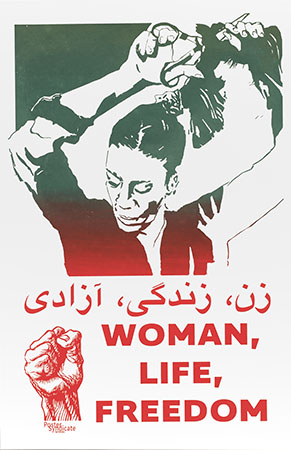 Right: Women, Life, Freedom, Clarion Alley Mural Project (CAMP); San Francisco Poster Syndicate; Art Hazelwood, Silkscreen, 2022, San Francisco, CA, 101853